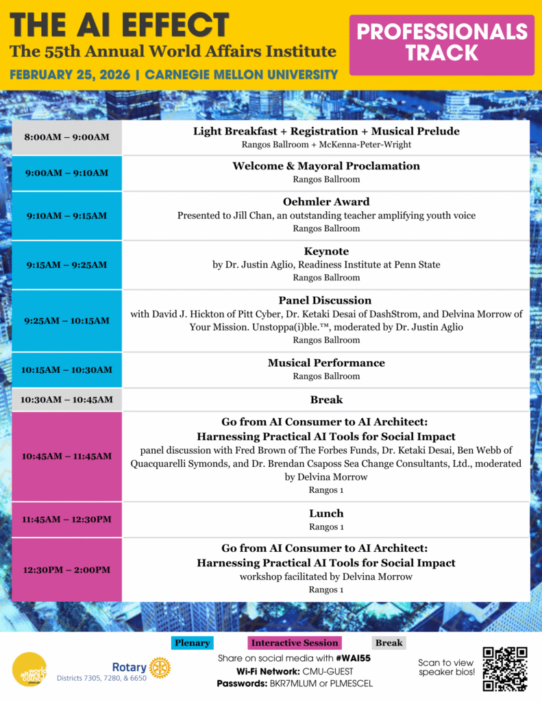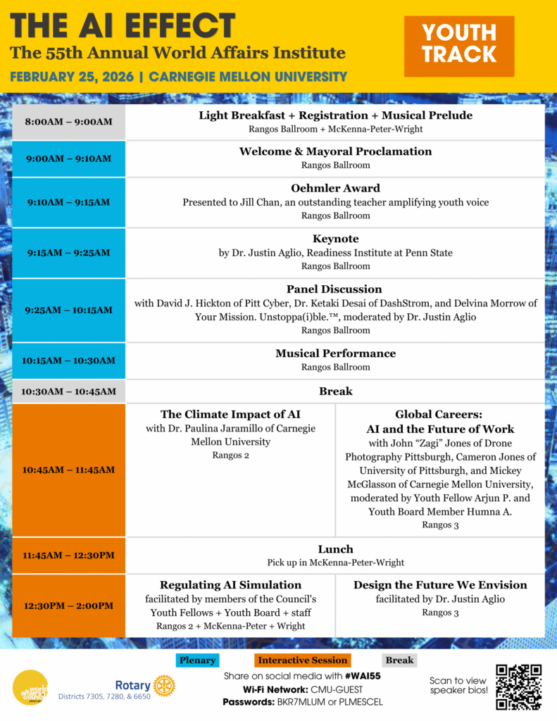 Hosted in partnership with Rotary Districts 7305, 7280, & 6650, the World Affairs Institute will take place on Wednesday, February 25, 2026 at Carnegie Mellon University. Doors open at 8:00AM, with programming running from 9:00AM–2:00PM.